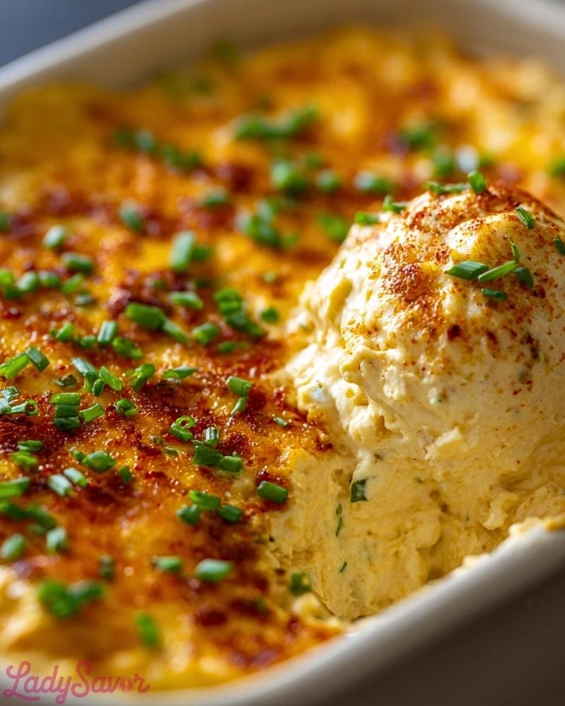 Turn your favorite deviled eggs into a hot, cheesy, and irresistibly creamy appetizer with this Humpty Dumpty Dip! Perfect for game day, potlucks, or holiday spreads, this quick and easy recipe blends cream cheese, sour cream, cheddar, and chopped hard-boiled eggs into a bubbly, oven-baked delight. Garnished with chives and paprika, it’s a standout on any snack table. If you’re hunting for quick breakfast ideas, cozy dinner dips, or just a crowd-friendly party food, this easy recipe is the one. Great for anyone searching for food ideas that balance comfort with indulgence.