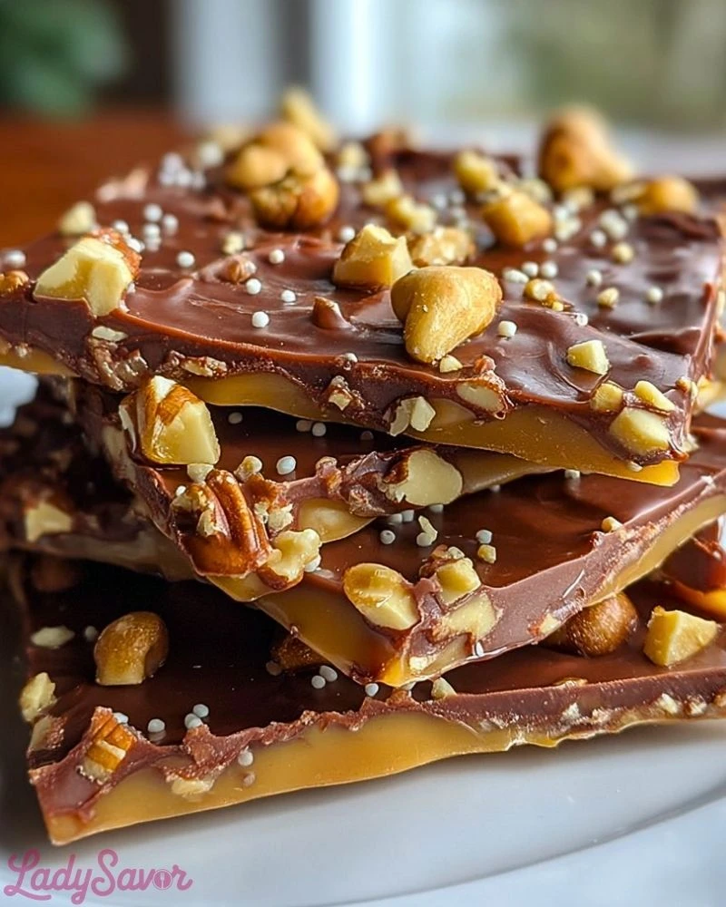 Before starting, measure out all your ingredients—once the toffee begins to boil, things move fast. Use medium heat to avoid burning the butter or sugar, and stir constantly until the mixture reaches the correct temperature. Be cautious when pouring the hot toffee onto the baking sheet—it’s extremely hot and can burn. Let the chocolate sit for a minute or two on the hot toffee before spreading to help it melt smoothly. And when sprinkling nuts or toppings, do it while the chocolate is still warm so everything sticks nicely.