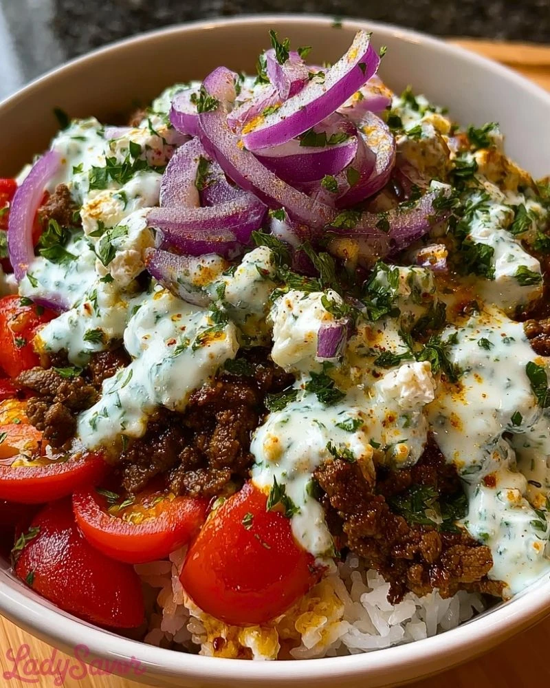 In a wide serving bowl, start with a generous layer of cooked rice. Top with a scoop of seasoned ground lamb. Add halved cherry tomatoes, red onion slices, and crumbled feta. Drizzle the dreamy creamy sauce generously over the top. Garnish with fresh parsley.