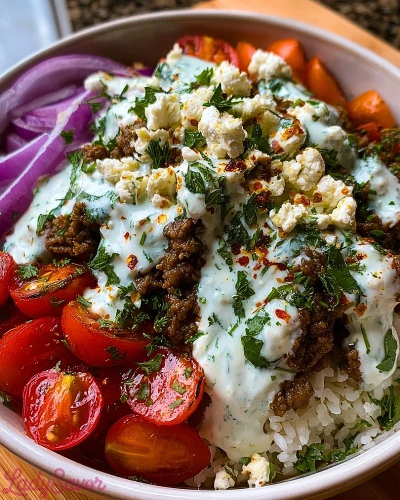 Lamb Gyro Bowls with Dreamy Creamy Sauce bring together all the vibrant, bold flavors of a classic Mediterranean gyro in a modern, easy-to-make rice bowl. Juicy, seasoned ground lamb is layered over fluffy rice, then topped with cherry tomatoes, red onions, crumbled feta cheese, and finished with a drizzle of rich, herb-loaded yogurt sauce. It’s a satisfying combination of warm, savory, tangy, and fresh—all in one spoonful.