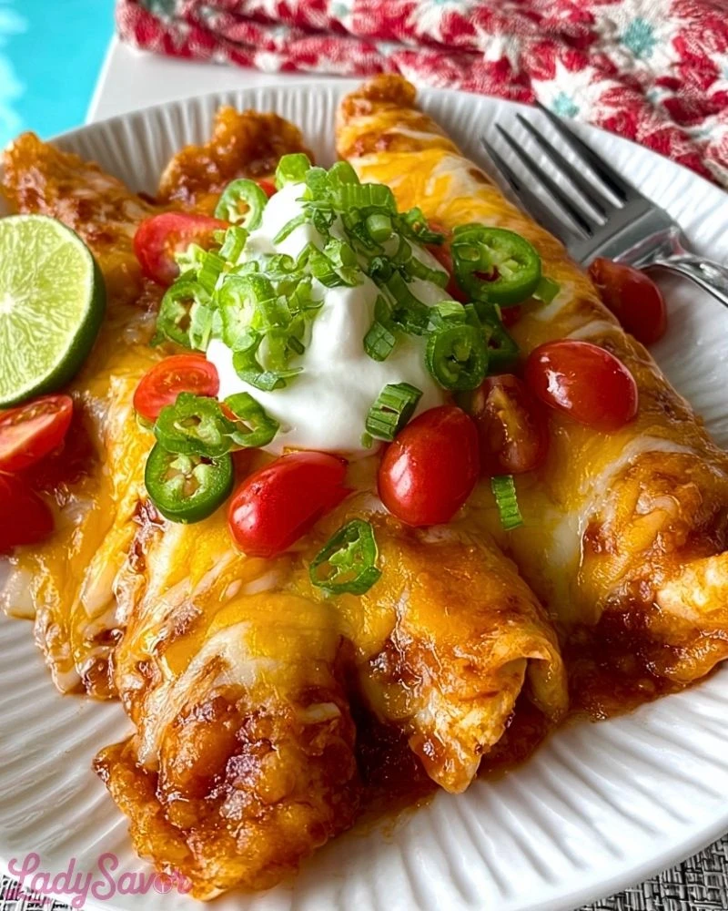 Looking for a no-fuss, flavorful dinner idea that tastes like you spent hours in the kitchen? These Lazy Enchiladas are your new go-to! Made with frozen taquitos, rich enchilada sauce, and a generous layer of melty cheese, this easy recipe is perfect for a quick dinner, family meal, or casual get-together. Topped with fresh ingredients like sour cream, tomatoes, and jalapeños, it’s packed with bold Mexican flavors without the traditional hassle. Whether you’re exploring new dinner ideas, craving a comfort dish, or needing an easy recipe to feed a crowd, this one checks every box—easy prep, quick bake, and crowd-pleasing results!
