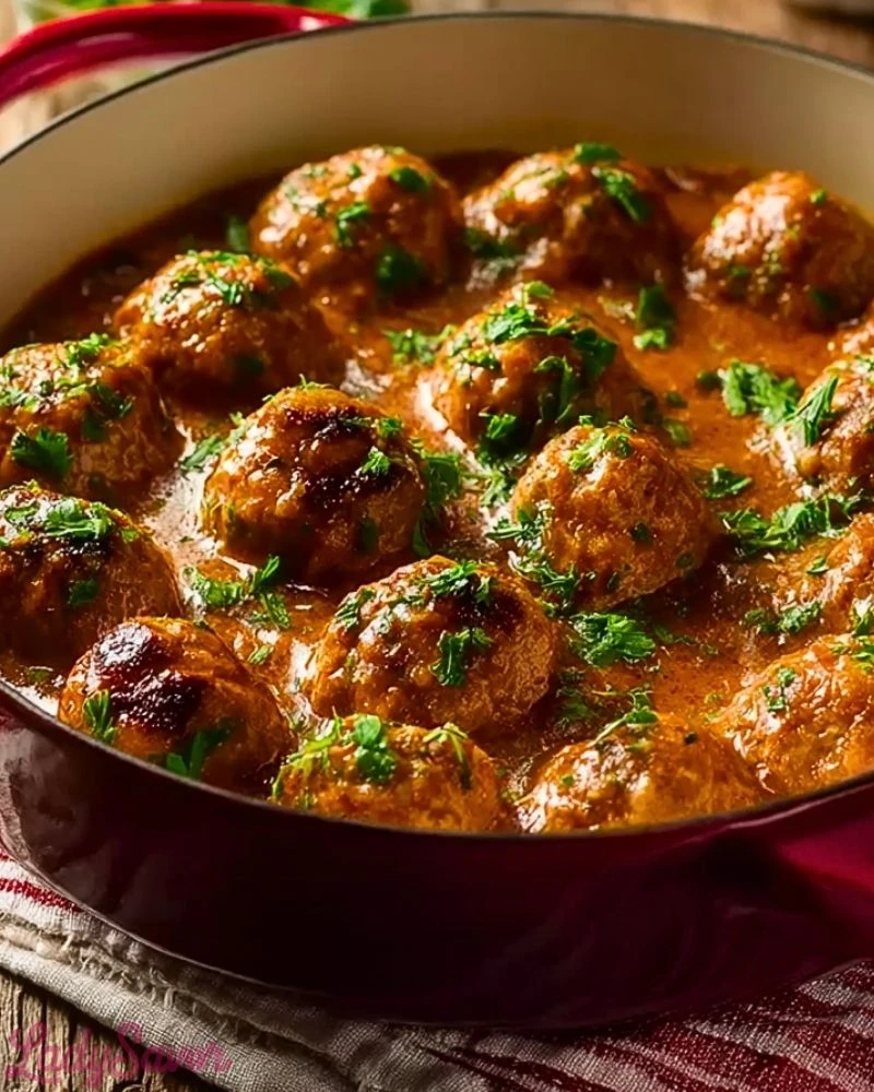 The meatballs are juicy and well-seasoned, made with a blend of ground beef and Italian sausage, then paired with a velvety sauce that includes garlic, heavy cream, and fresh herbs. The finishing touch? A handful of chopped parsley for freshness and color. Every bite is rich, savory, and utterly unforgettable.