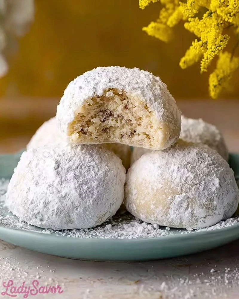 - Powdered Sugar – Used both in the dough and generously dusted over the baked cookies for that snowball look.