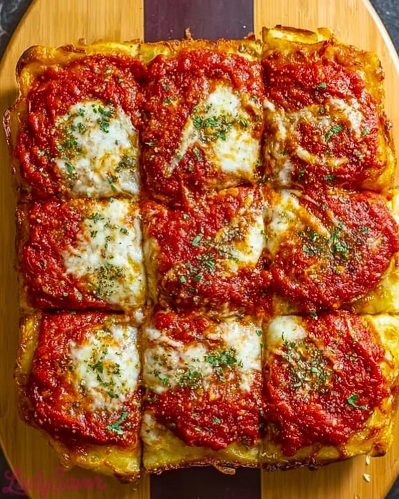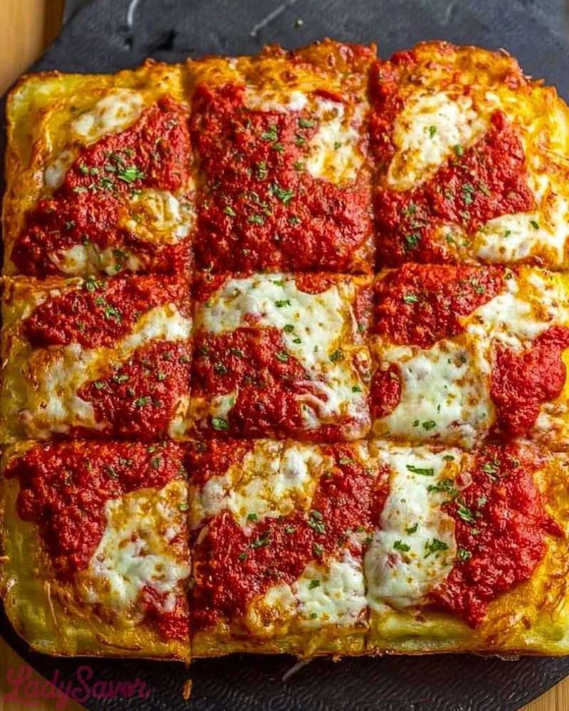 Sprinkle grated Parmesan and chopped parsley or basil over the top just before serving. Cut into squares and enjoy that unmistakable New York bakery-style bite.