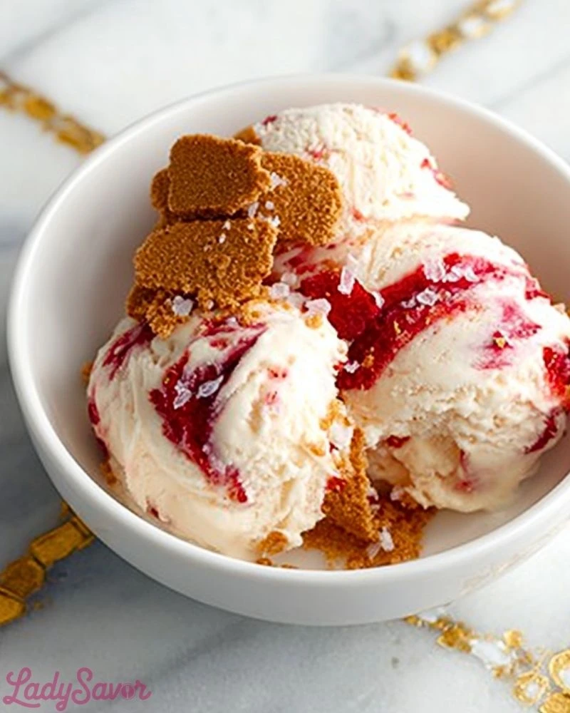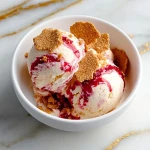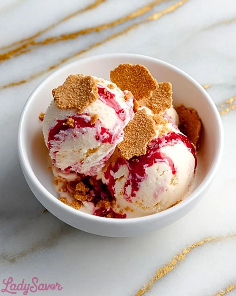 Scoop the ice cream into a bowl and enjoy immediately. The contrast of creamy cheesecake base, fruity strawberry ribbons, and crunchy graham cracker pieces makes every bite satisfying.