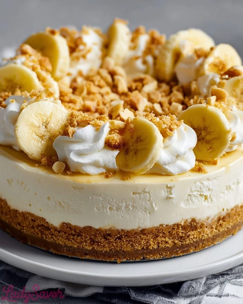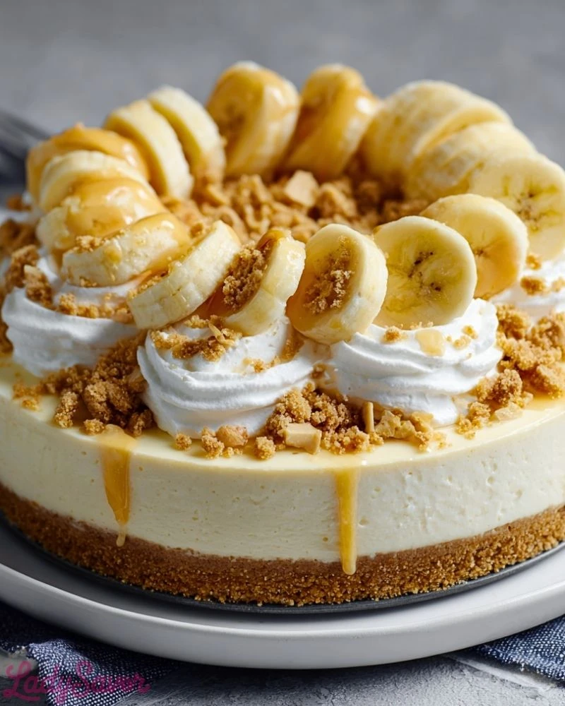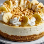 Just before serving, decorate the cheesecake with whipped cream swirls, fresh banana slices, and a generous sprinkle of crushed cookies. For an extra indulgent touch, drizzle caramel or honey over the top. Slice using a warm knife for clean cuts and serve chilled.