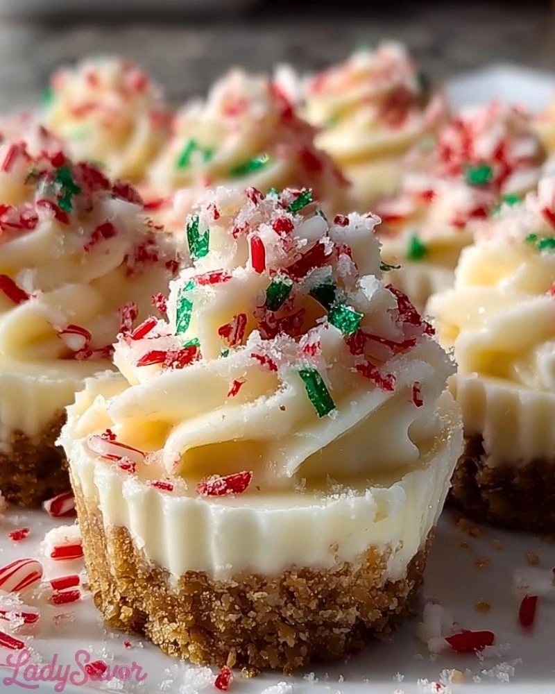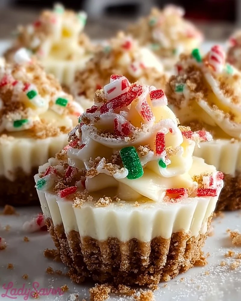 Before serving, top each mini cheesecake with whipped topping and sprinkle with holiday decorations or crushed peppermint. Serve chilled for the best texture and taste.