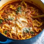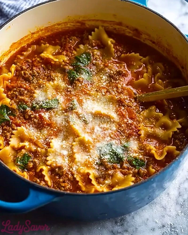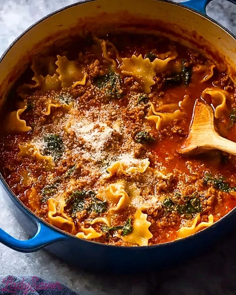Start by browning your meat thoroughly to build deep flavor — don’t rush this step. Drain excess fat if needed, then sauté your aromatics (onion, garlic) directly in the same pot. Add herbs early to bloom their flavor, and break the lasagna noodles into manageable pieces before adding. Simmer gently to let everything meld together. Right before serving, stir in your cheese and watch the soup transform into creamy, lasagna-inspired heaven. Taste and adjust for salt and spice — and don’t forget to ladle over some ricotta or shredded mozzarella for that finishing touch.