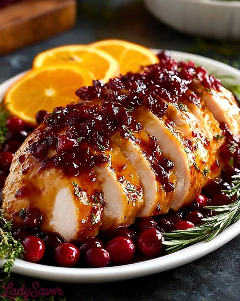 To serve, slice the turkey breast and spoon additional warm glaze over the top. Garnish with extra cranberries, orange slices, and sprigs of fresh thyme or rosemary for a stunning presentation.