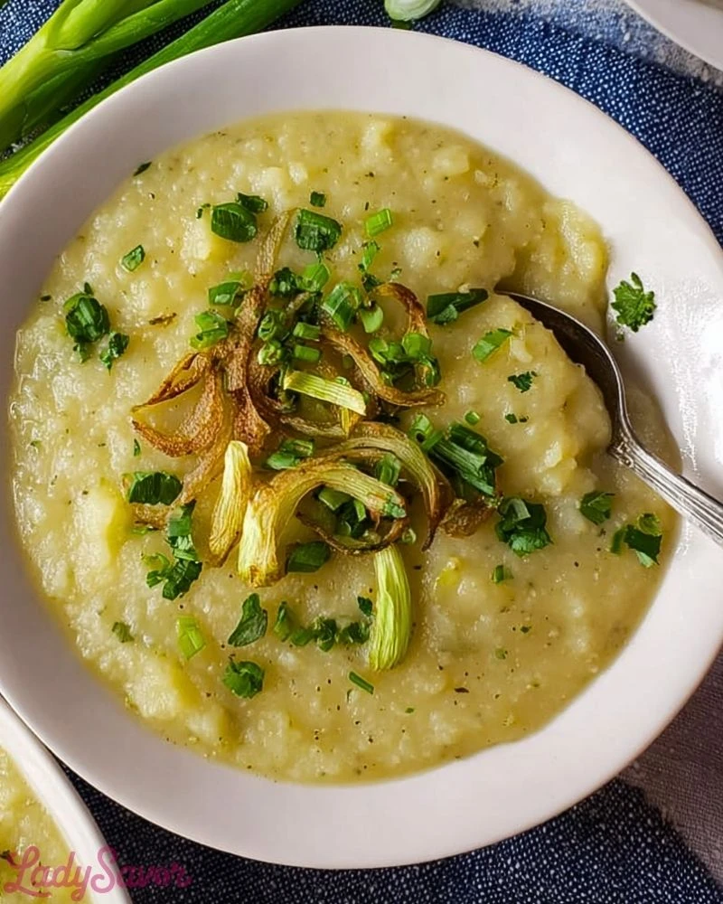 Ladle the soup into bowls and top with chopped parsley, sliced green onions, and optional crispy fried leeks or onions. Serve hot with crusty bread or a side salad for a complete meal.
