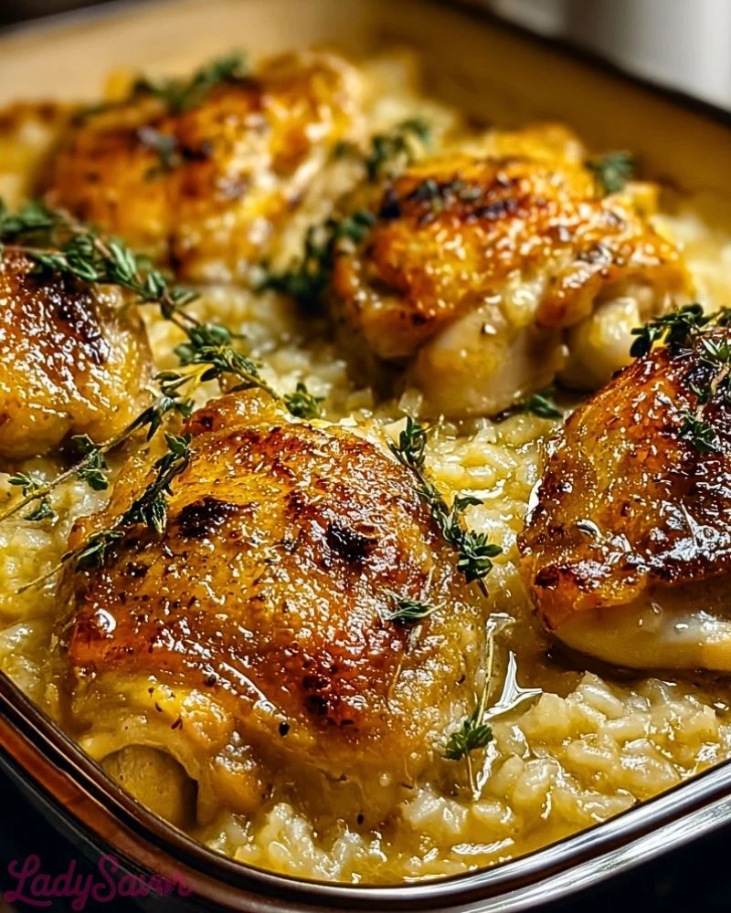 Pour the creamy rice mixture into the prepared baking dish. Spread it out evenly. Nestle the chicken thighs on top, skin side up. Do not stir—let the chicken sit right on top of the rice so the juices drip down during baking.