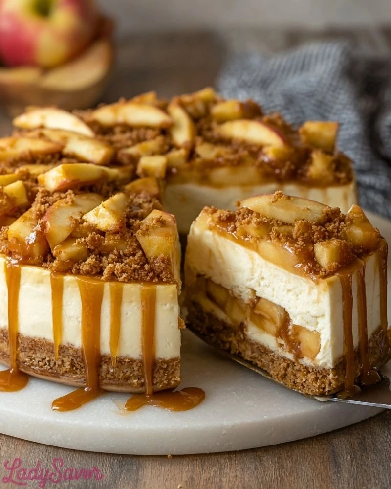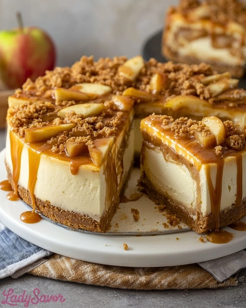 - It’s a hybrid dessert—cheesecake meets apple pie with a caramel twist.