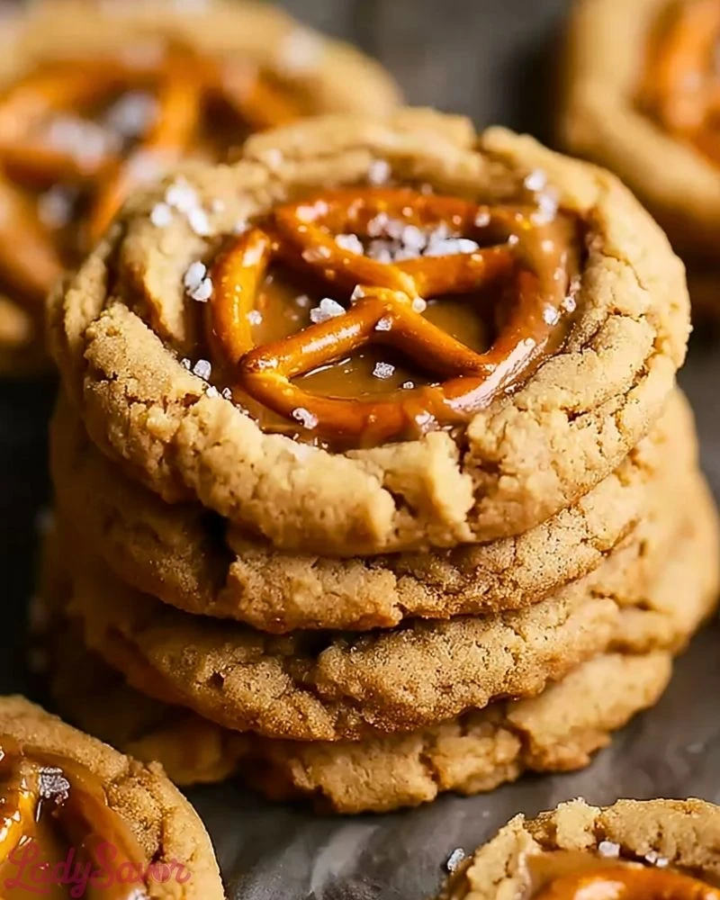 Keywords: peanut butter cookies, salty sweet cookies, pretzel caramel cookies, easy dessert, cookie recipe, snack ideas