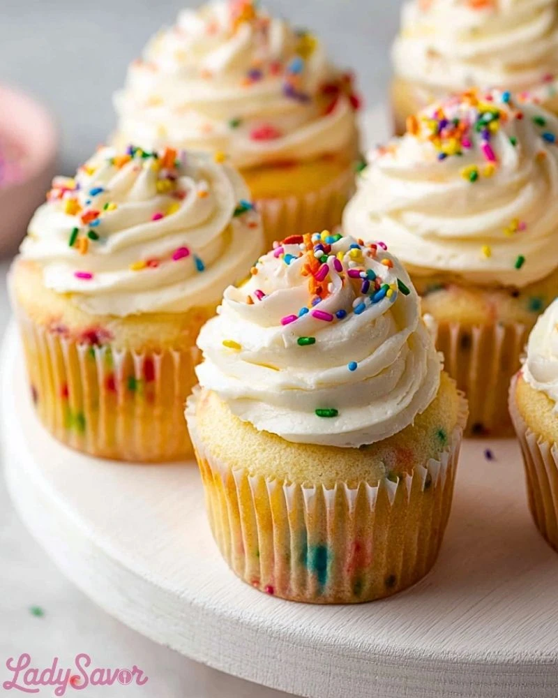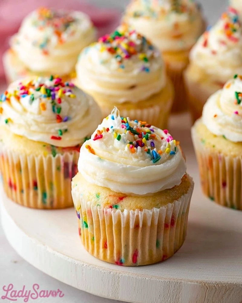 They’re light, fluffy, and packed with bursts of color from classic rainbow sprinkles. The flavor is buttery and vanilla-forward without being too sweet. Plus, they stay moist for days and pair beautifully with almost any frosting. What I especially love is that they don’t require a mixer, making them super approachable for beginners and quick to whip up for last-minute occasions.