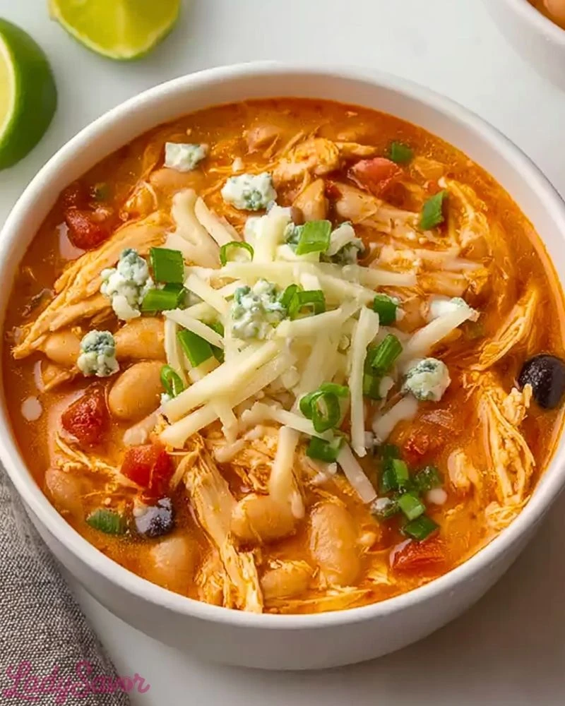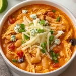 For best results, use boneless, skinless chicken breasts or thighs — they shred beautifully after slow cooking. Rinse and drain canned beans to reduce extra sodium. Add cream cheese at the end to keep the broth rich and creamy without curdling. Don’t skip the buffalo sauce; it’s the star of the dish, but feel free to start with a smaller amount if you’re spice-sensitive. Garnish with shredded cheese, green onions, or even a drizzle of ranch or blue cheese dressing to mimic that classic buffalo flavor profile.