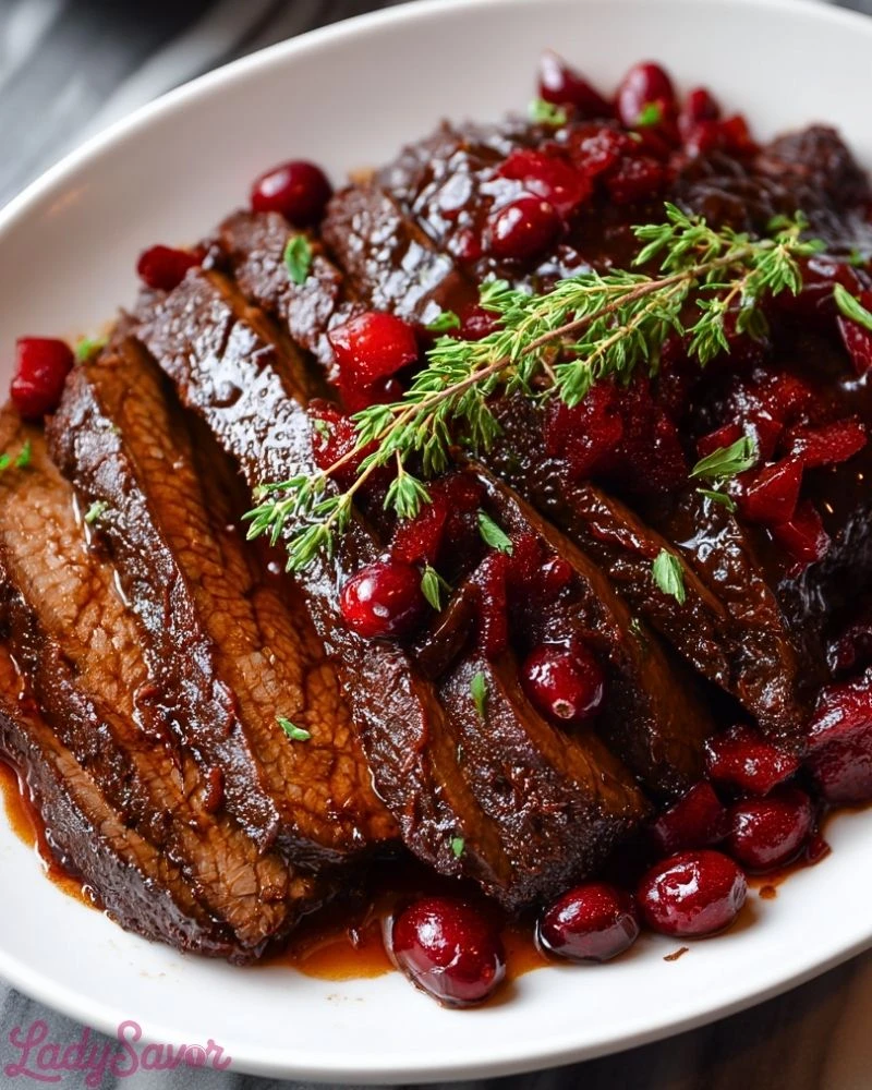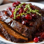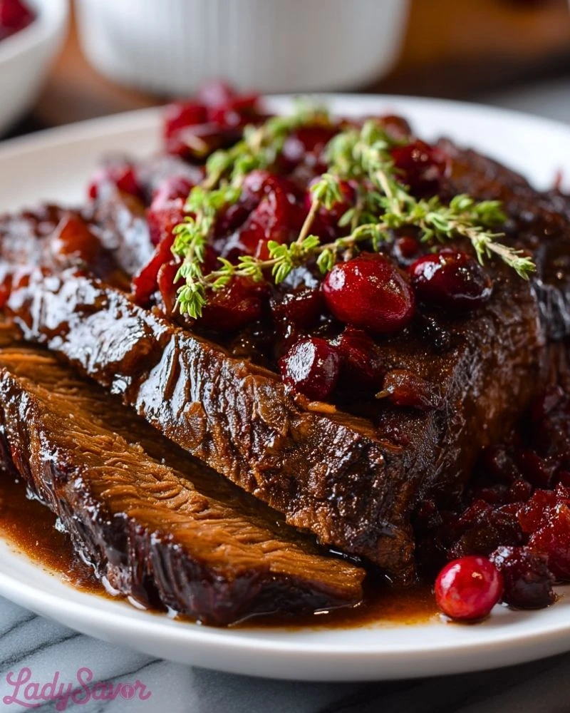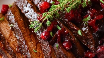 Let the brisket rest for 10–15 minutes before slicing against the grain. Pour some of the glaze over the top and garnish with additional cranberries, fresh herbs, or a sprinkle of parsley for color. Serve with your favorite sides like mashed potatoes, roasted vegetables, or crusty bread.