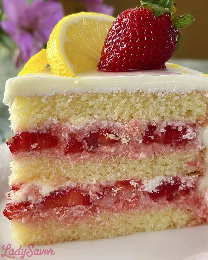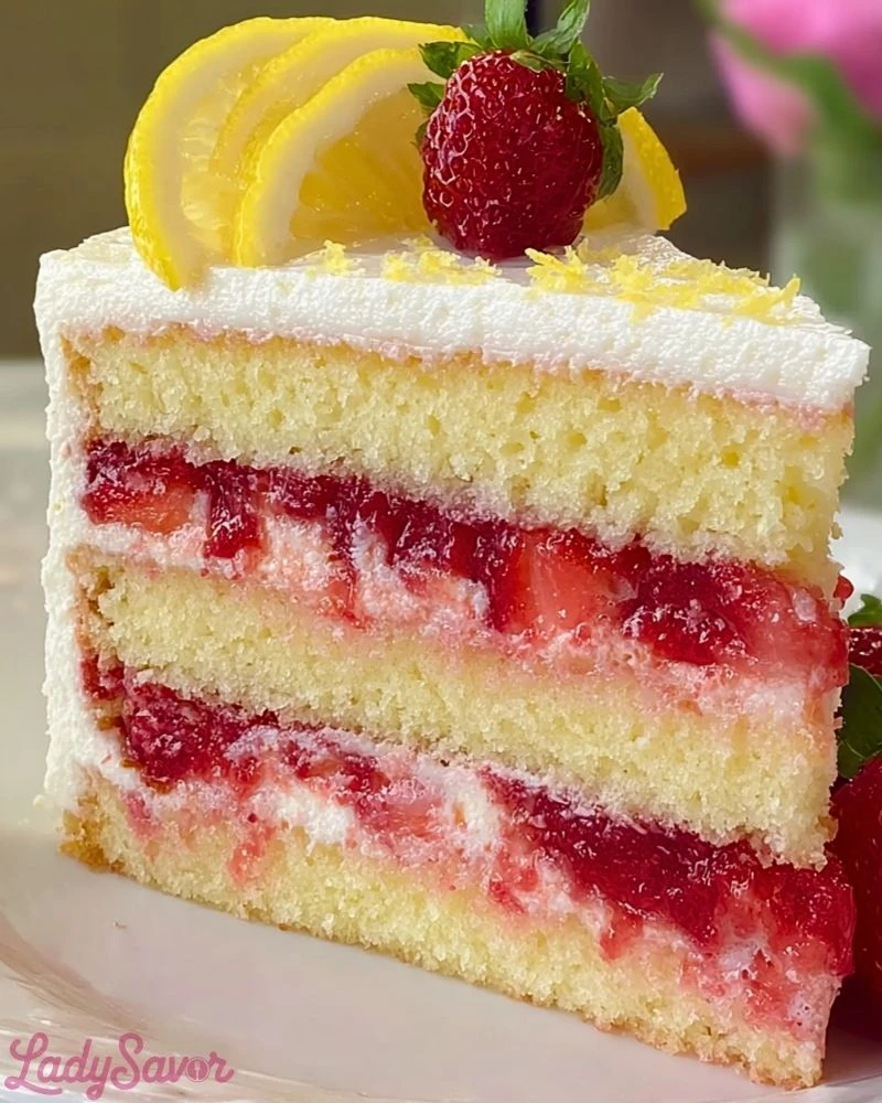 For the best flavor, use freshly squeezed lemon juice and zest — it makes a noticeable difference in brightness and aroma. You can prepare the strawberry filling and cake layers a day ahead and store them separately; this not only saves time but also enhances the flavor as everything settles. If the cake layers dome during baking, level them with a serrated knife to stack evenly. Allow the assembled cake to chill for at least an hour before slicing to ensure clean cuts and stable layers.