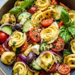 In a large mixing bowl, combine the cooked and cooled tortellini with the prepared vegetables, feta cheese, and herbs. Pour the dressing over the top and gently toss until everything is evenly coated. Be careful not to mash the tortellini or break the feta too much—gentle mixing is key.