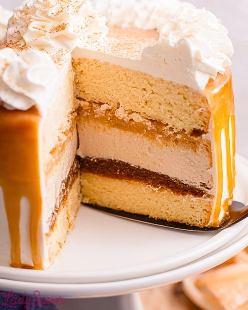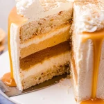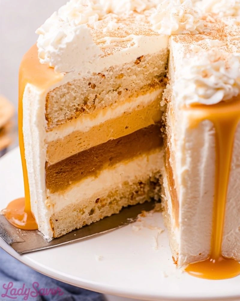 Place the cheesecake layer on a cake board or stand. Spread a thin layer of frosting on top. Add the spice cake layer, more frosting, then the pumpkin pie. Trim layers as needed to make them even. Frost the entire cake with whipped cream or buttercream, smoothing with an offset spatula.