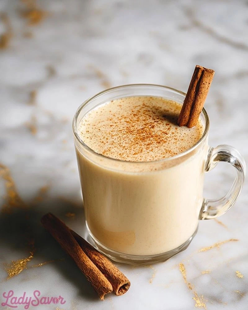 Pour into mugs or glasses and sprinkle with extra nutmeg or cinnamon. Garnish with a cinnamon stick for a festive touch. Add a splash of dark rum or bourbon if desired.